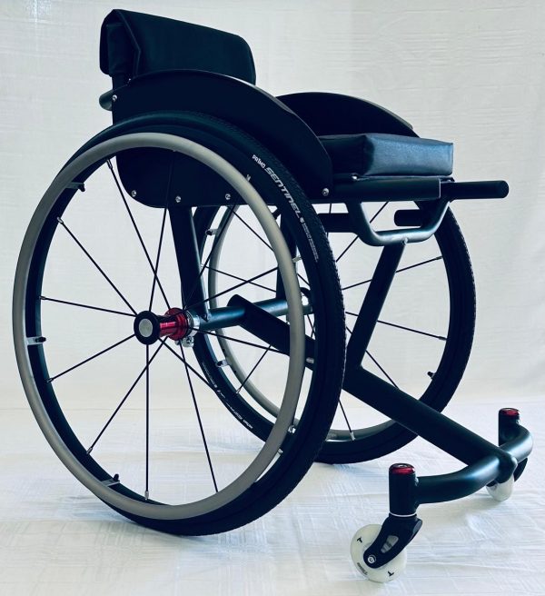Especificação Técnica:Estrutura em alumínio liga 6061 – sob medida; Eixo transversal reto com sistema de ajuste de abertura das rodas, recepção do quick-release em alumínio com alma em aço; Conjunto Roda traseira – montada em aro aero em alumínio para 12 raios inox reforçado (24”), aro propulsor com seis garras Ø 21mm anodizado, cubo de alumínio montado com rolamento, com capacidade de eixo de ½ “,espaçamento entre rolamentos, eixo quick-release ½”, temperado, retificado e testado; Roda dianteira 72 mm a 5” preta, rolamento Abec 11, garfo com base para dois rolamentos, sistema de fixação de rodas dianteiras com performance de competição, sistema de fixação do eixo vertical para alto desempenho; Estofamento em tecido em Nylon , com almofada em alta densidade; Os produtos possuem garantia de seis meses contra defeitos de fabricação;
